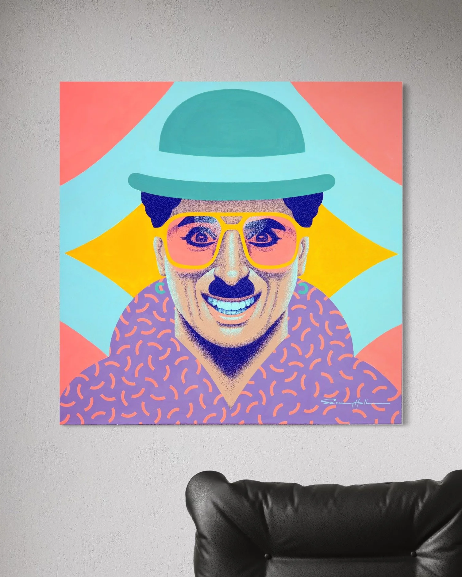 Between geometric blocks, pointillism, and Memphis-inspired patterns, Chaplin becomes a joyful, graphic, and timeless character. A symbol of universal laughter, he spans the ages—from silent cinema to contemporary pop culture in a bold and luminous portrait.